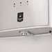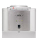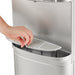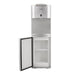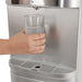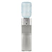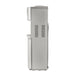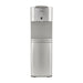 Dispensador de agua plateado con placa en inox con indicadores luz led y botones dispensadores de agua para cada temperatura Caliente, frío y al clima y sistema de seguridad para niños en el modo de agua caliente.