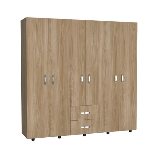 Closet bariloche bombay, café claro y blanco duqueza con variedad de entrepaños y seis puertas abatibles