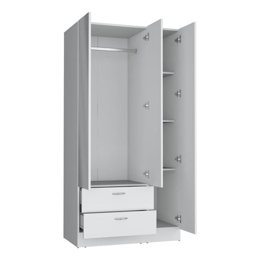Virtual Mueblesen stockCloset, con 1 tubo cromado, 2 cajones, 4 de entrepaños y, 3 puertas batientes con manijas metálicas. Elaborado en Madera aglomerada MDP, recubier...