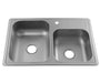 Lavaplatos de acero inoxidable, diseñado para instalación de empotrar o submontar, con dos tanques que facilitan las labores de lavado y enjuague. Incluye una perforación para la instalación de grifería sencilla o monomando.