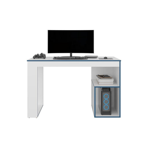 Escritorio Gamer Astana, Blanco Duqueza y Azul, con dos entrepaños y amplia superficie