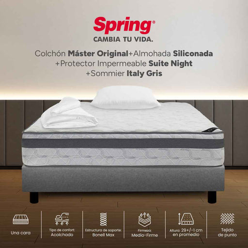 Combo colchon spring master original-120x190 + sommier italy gris + set x 2 almohadas siliconadas + protector