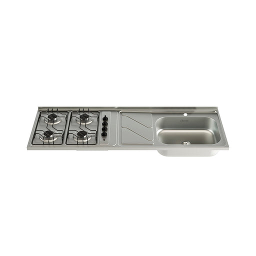 Mesón con lavaplatos en acero inoxidable 150×52 cm y estufa a gas marca Socoda