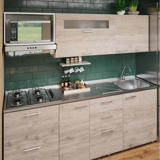 Mesón con lavaplatos en acero inoxidable 210×52 cm y estufa a gas marca Socoda