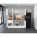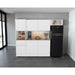 Alacena, en la parte superior con 2 puertas batientes, con amplios espacios para guardar alimentos e implementos de cocina, con espacio para nevera, en la parte inferior cuatro puertas abatibles, un cajón, amplios espacios para guardar alimentos y electrodomésticos.