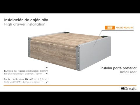 Para instalación con rieles de montaje bajo Bonuit, cierre lento y push to open integrado HRE710, cierre lento HRE790 y push to open HRE780. No incluidos, se deben comprar por separado.