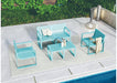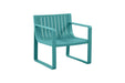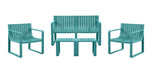 Elaborado en Polipropileno el set incluye mesa centro, dos sillas y un banco, en Color Azul Marino
