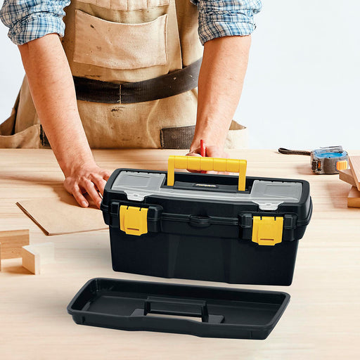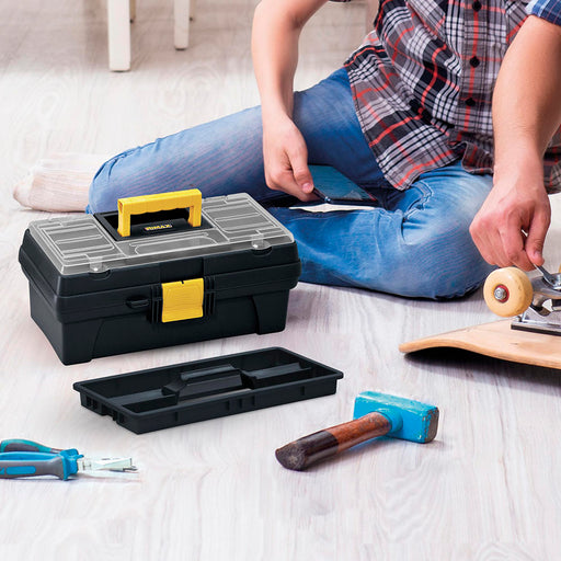 Caja herramientas 12" con tapa organizadora cerradura plástica negro marca Rimax