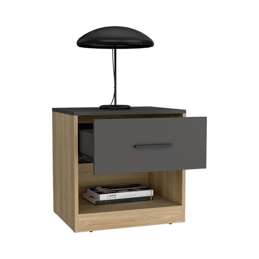 Mesa de Noche Giroa, Plata Oscuro y Fresno Europeo, con espacio para colocar objetos decorativos