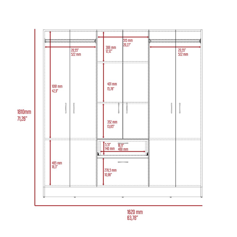 Closet adira, wengue y blanco, con dos tubos cromados y seis puertas batientes