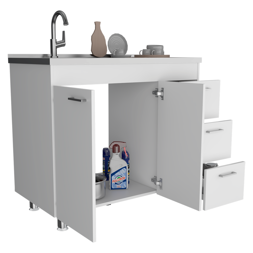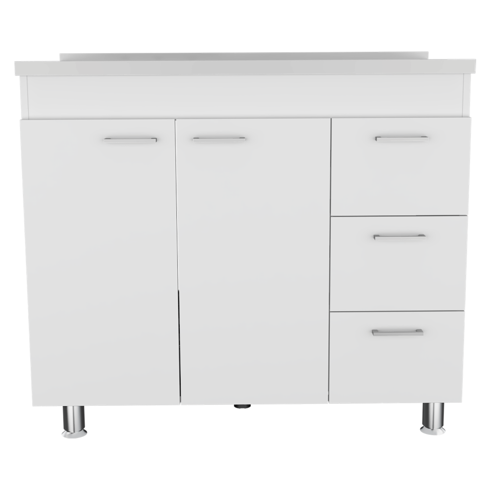 Gabinete inferior stella, blanco perla, con dos puertas batientes y tres cajones deslizables, con mesón izquierdo