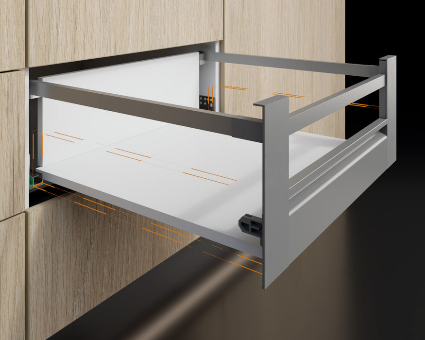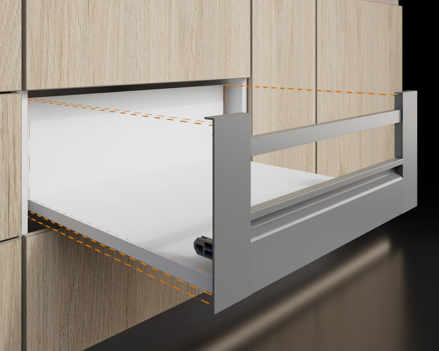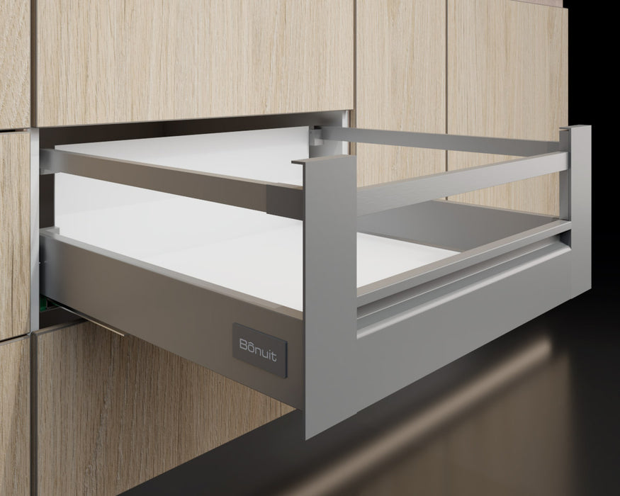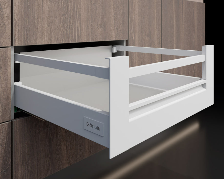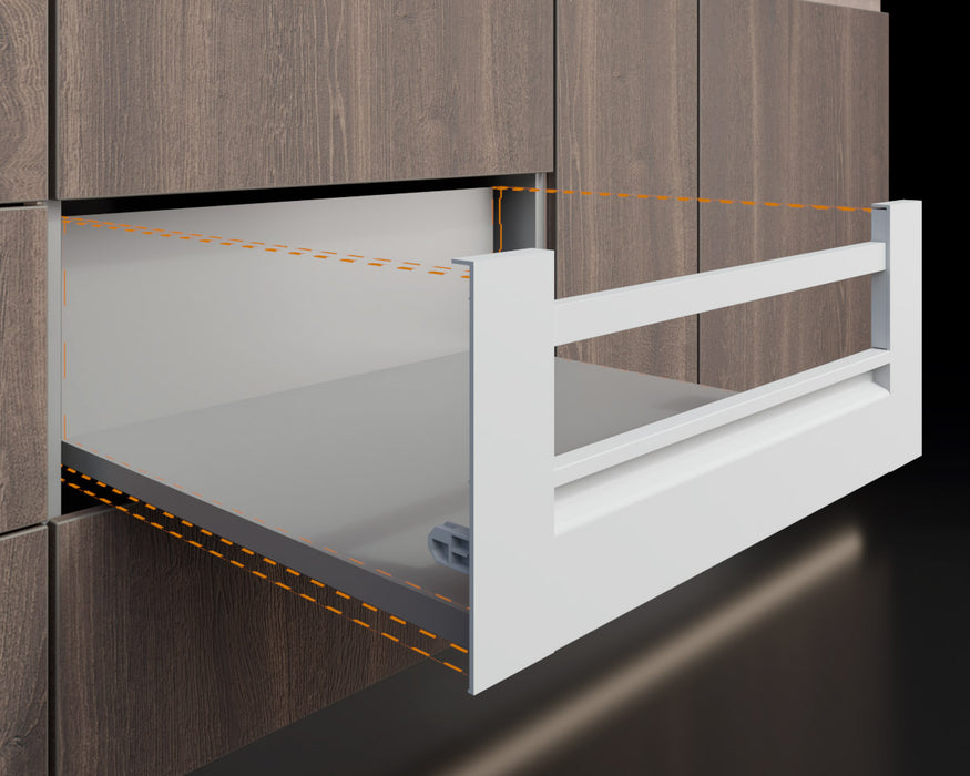 Frontal alto Bonuit MAX 220.5mm, para cajón costado metálico bonuit MAX, brindando estabilidad y profundidad a los cajones, ideal para alacenas, muebles de baño, centros de entretenimiento y clóset, Incluye: Un frontal.