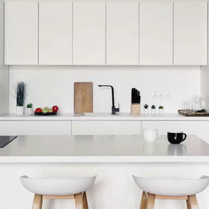 Laminado de alta presión color Blanco Calibre_0.6 mm, No Posformable Es una lámina compuesta por papel decorativo impregnado con resina de melamina, diseñada para recubrir superficies con máxima resistencia al impacto, desgaste, rayado y abrasión, ofreciendo durabilidad, estética y protección en cualquier aplicación. Nota importante : Se recomienda trabajar laminado en las dos caras de la superficie para evitar el pandeo.