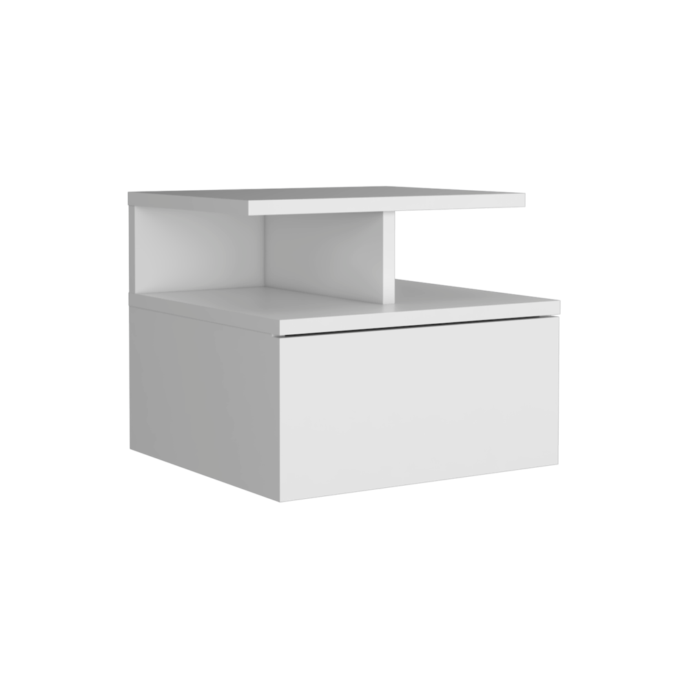 Mesa de Noche Flotante Nube, Blanco con un Cajón y División de dos Entrepaños
